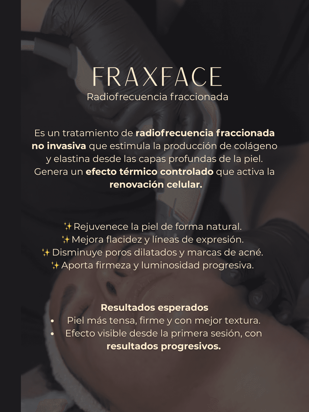 Es un tratamiento de radiofrecuencia fraccionada que trabaja en capas profundas de la piel para mejorar textura, poros, líneas finas y cicatrices leves, estimulando colágeno nuevo y renovando la superficie cutánea sin tiempo prolongado de recuperación. Rejuvenece la piel de forma natural, mejora flacidez y líneas de expresión, disminuye poros dilatados y marcas de acné. Aporta firmeza y luminosidad progresiva. Efecto visible desde la primera sesión, con resultados progresivos.