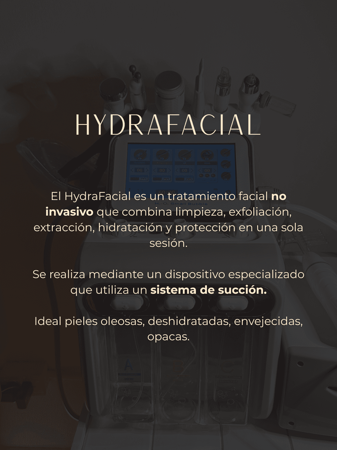 Es un tratamiento no invasivo que combina limpieza profunda, exfoliación, extracción por succión inteligente e hidratación intensa con sérums específicos. Deja la piel más luminosa, suave y revitalizada desde la primera sesión.