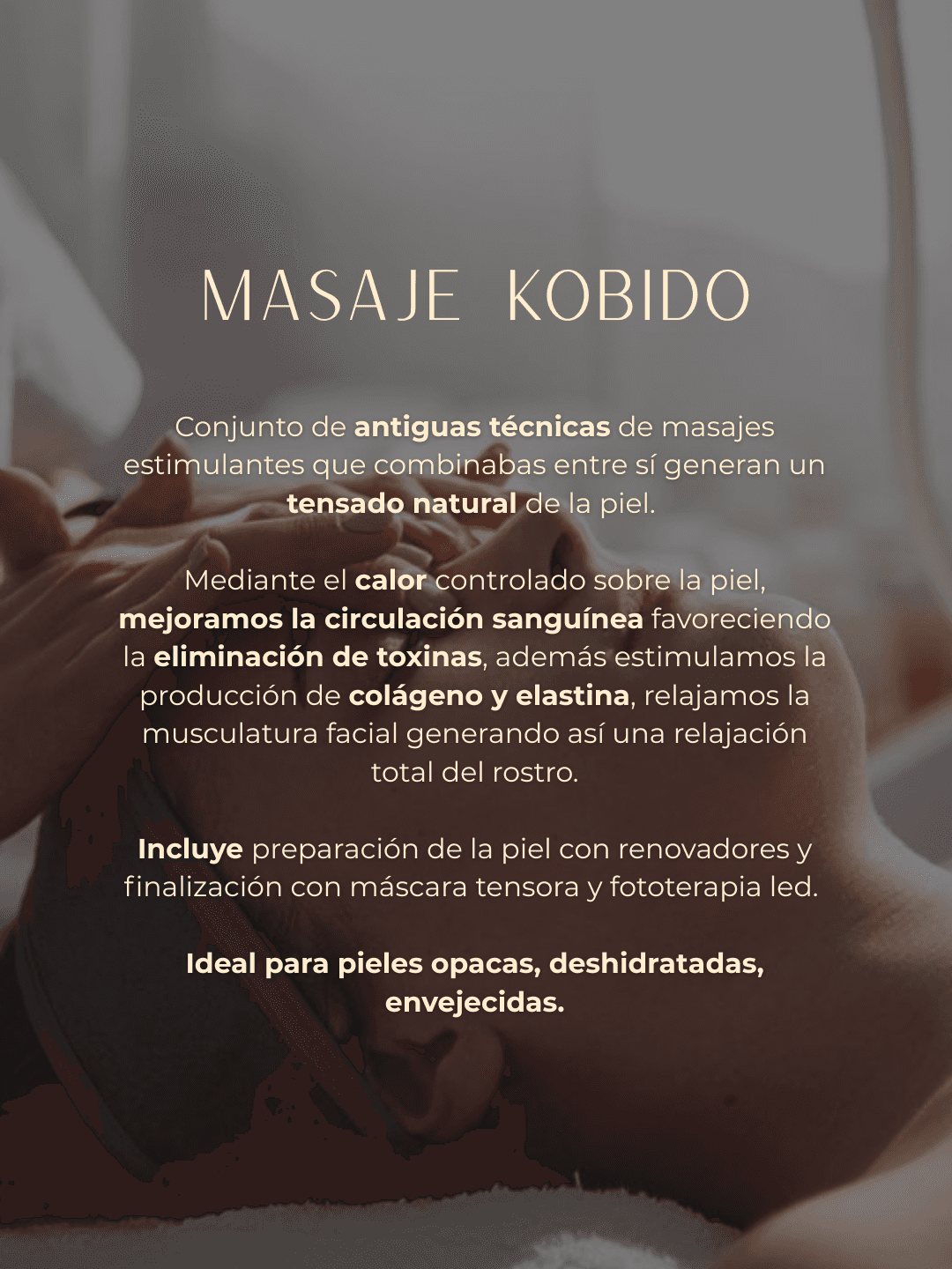 Conjunto de antiguas técnicas de masajes estimulantes que combinadas entre sí generan un tensado natural de la piel. Mediante el calor controlado sobre la piel, mejoramos la circulación sanguínea favoreciendo la eliminación de toxinas, además estimulamos la producción de colágeno y elastina, relajamos la musculatura facial generando así una relajación total del rostro. Incluye preparación de la piel con renovadores y finalización con máscara tensora y fototerapia led. Ideal para pieles opacas, deshidratadas, envejecidas.