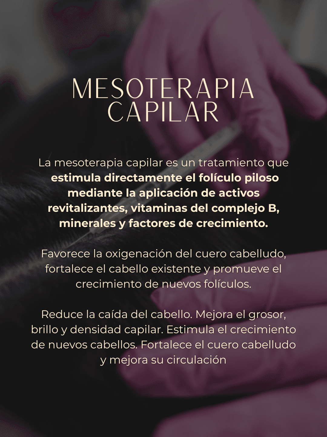 Aplicación de microinyecciones superficiales en cuero cabelludo con cóctel de activos para mejorar el aspecto de vitalidad y brillo del cabello. Incluye: limpieza, aplicación de mesoterapia y masaje suave. Duración estimada: 45–60 min. Frecuencia sugerida: plan de 4 a 6 sesiones. Advertencia: Uso profesional. Puede no ser apto para todas las personas. No sustituye consulta médica.