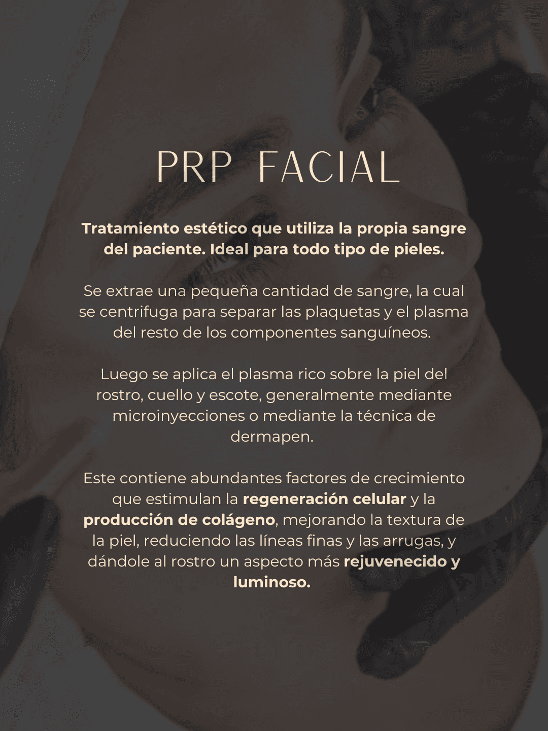 Es un tratamiento donde se extrae una pequeña muestra de tu sangre, se centrifuga y se obtiene plasma rico en plaquetas que contiene factores de crecimiento naturales. Ese plasma se aplica en la piel para regenerarla, mejorar textura y estimular colágeno. El plasma rico en plaquetas contiene abundantes factores de crecimiento que estimulan la regeneración celular y la producción de colágeno, mejorando la textura de la piel, reduciendo las líneas finas y las arrugas, y dándole al rostro un aspecto más rejuvenecido y luminoso.